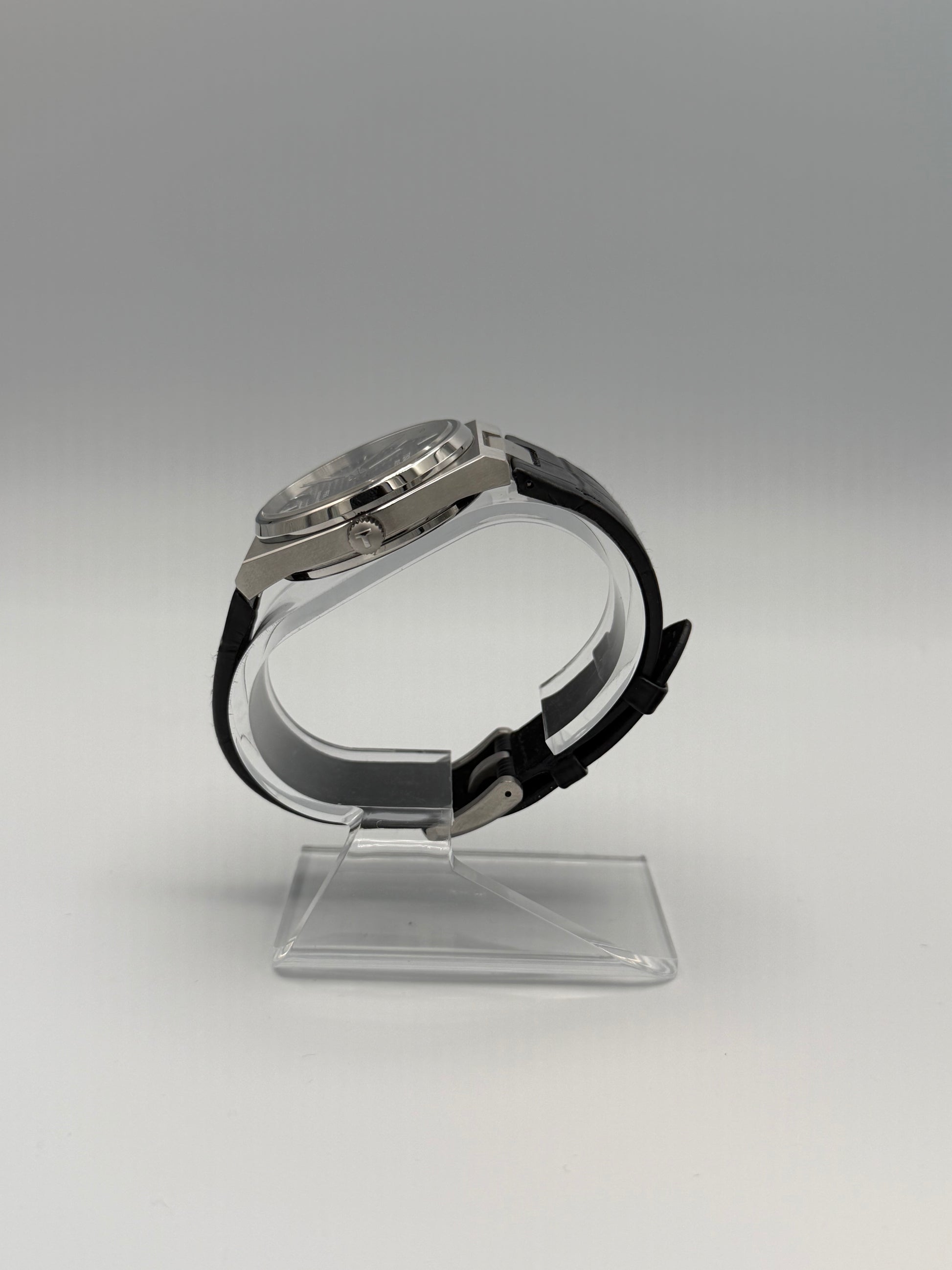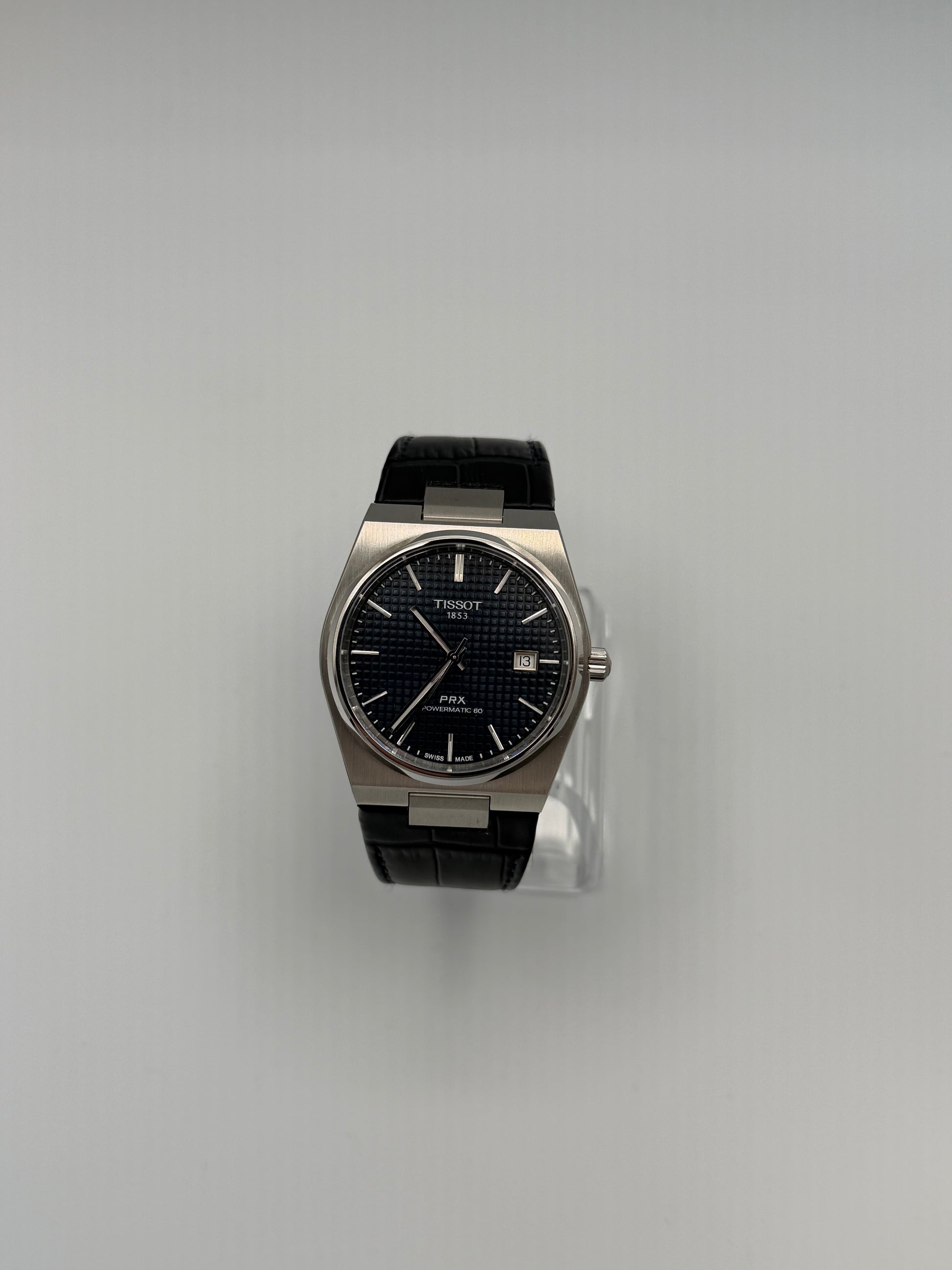 A sleek 40mm PRX with a rich blue textured dial and premium leather strap. Powered by the Powermatic 80 automatic movement with an 80-hour reserve, sapphire crystal, and 100m water resistance. A modern Swiss classic with vintage-inspired style.